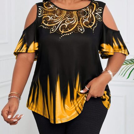 plus size women’s gradient print cold shoulder t shirt – Color : Yellow – Size : 0XL