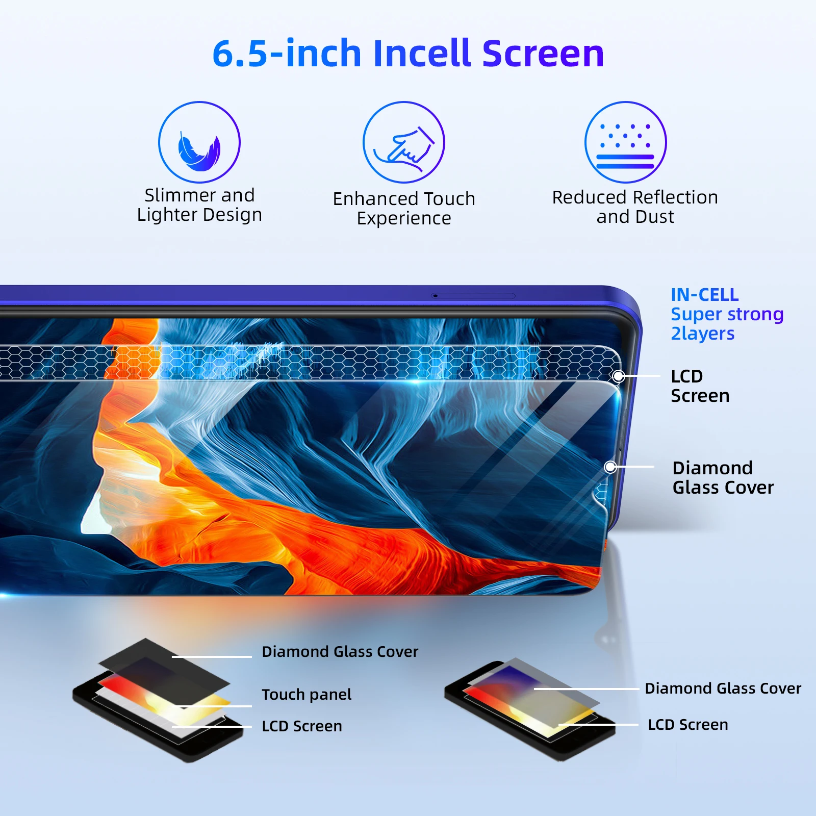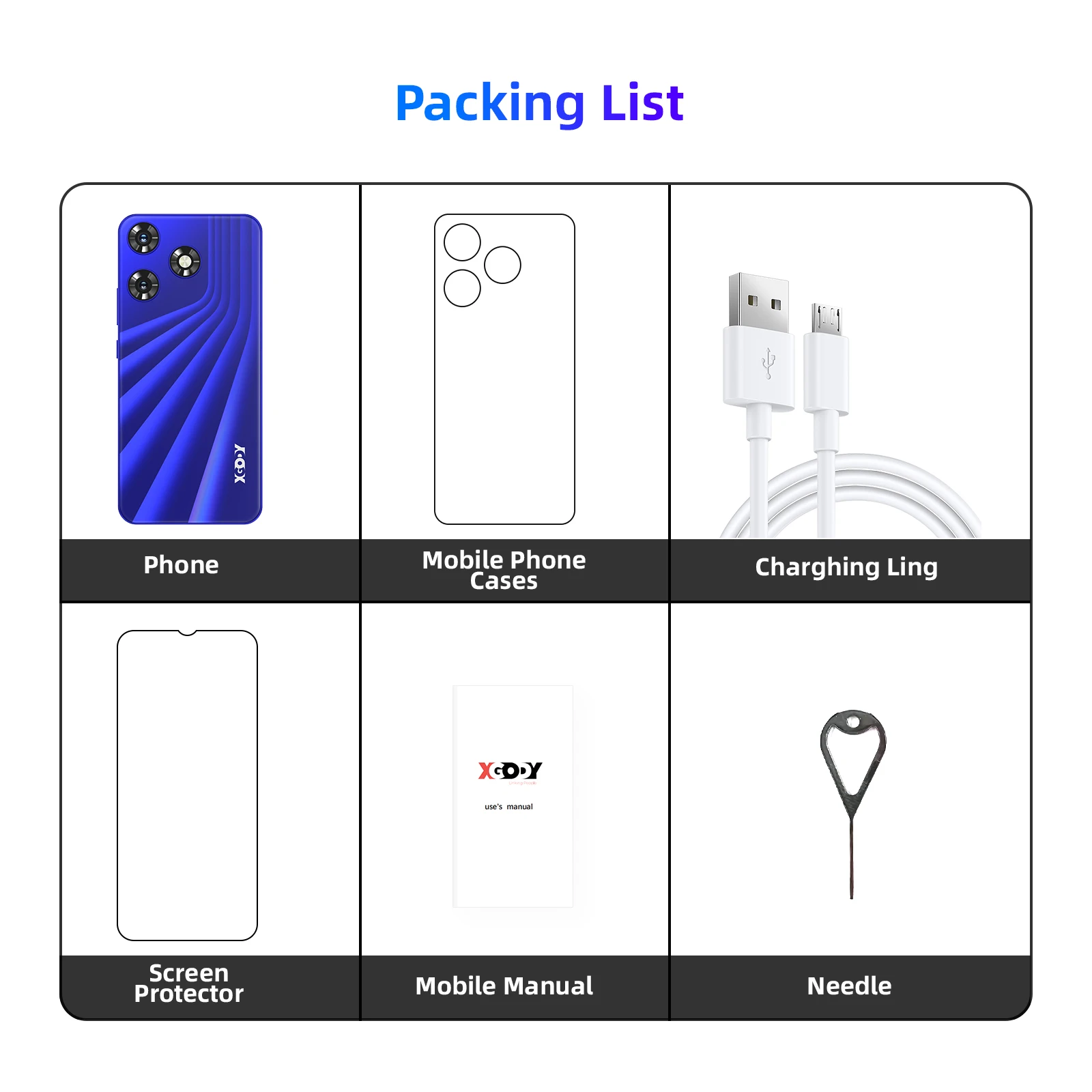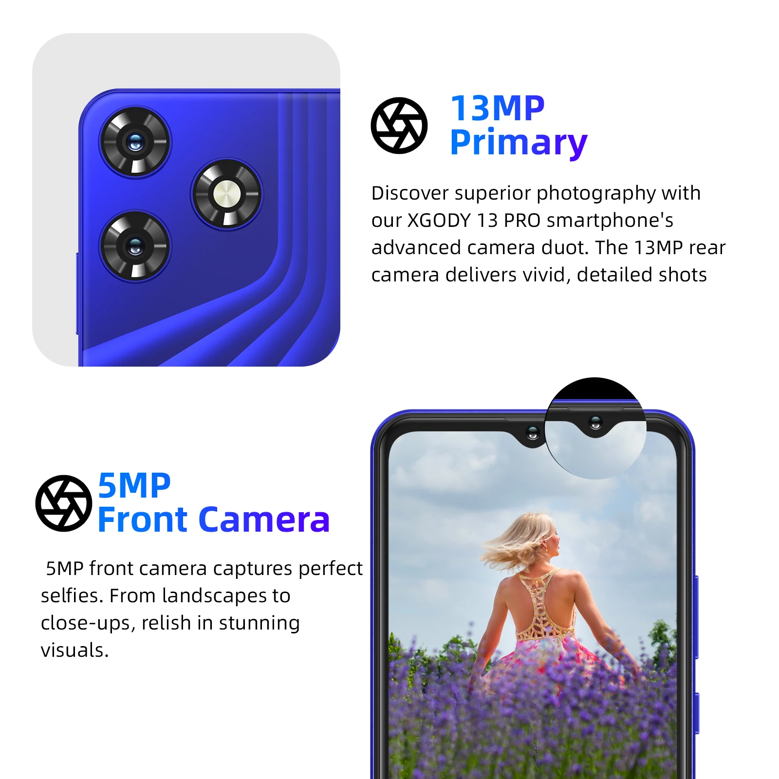 The XGODY-13 Pro New is a 4G Android smartphone featuring a 6.52 inch display, 3750mAh battery, 16GB ROM, dual SIM capability, and a 5MP front camera with 13MP rear camera. Unlocked for use with most carriers.